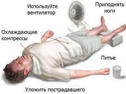 Положить на голову холодный компресс (мокрое полотенце) или смочить голову холодной водой. Если есть возможность - обернуть пострадавшего влаж-ной простыней или осторожно облить его прохладной водой; приложить к голо-ве, подмышечным, паховым и подколенным областям лед или бутылки с холод-ной водой.